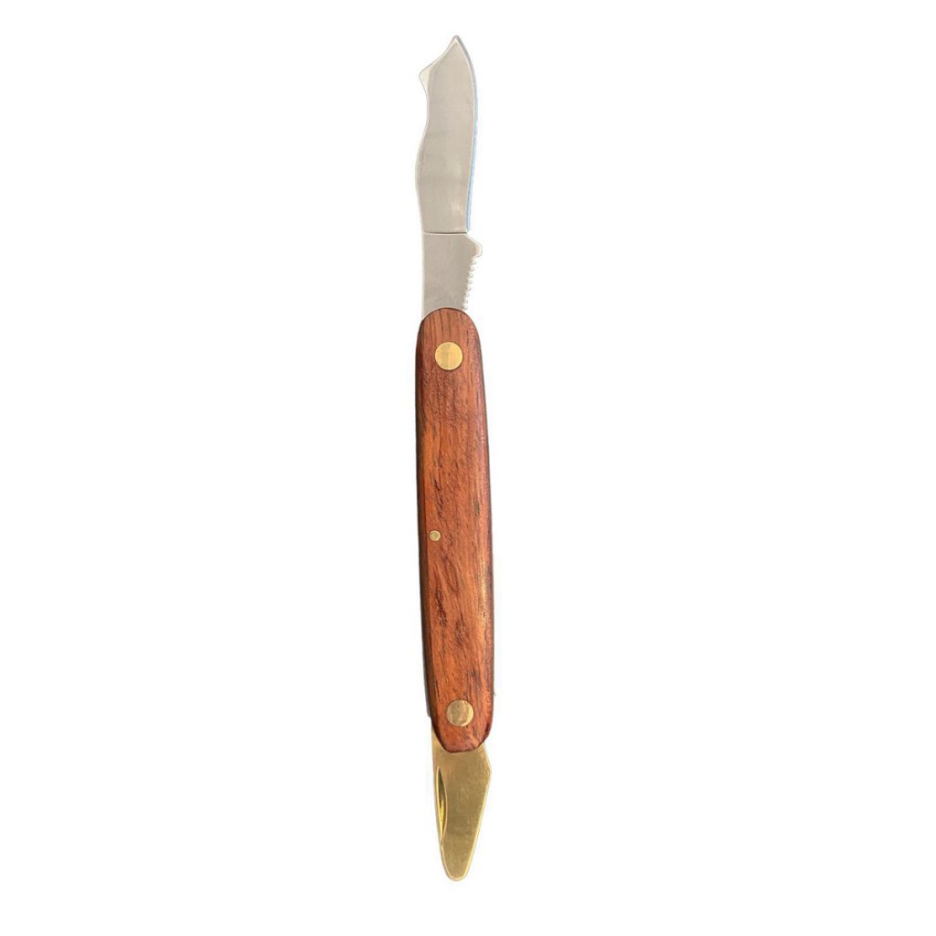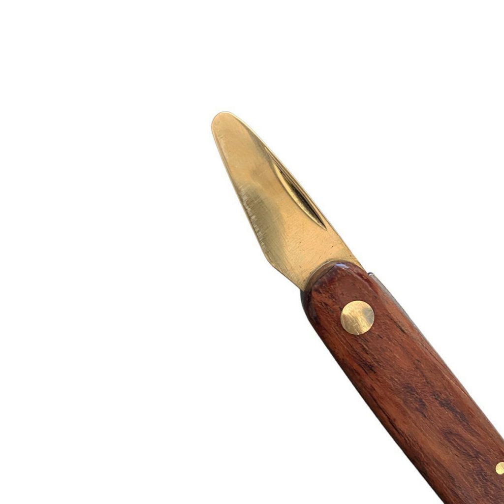 Fabricada en acero de carbono especial satinado, provista de hoja fina de latón. Con espátula en la parte trasera para realizar el injerto y levantar la corteza.
